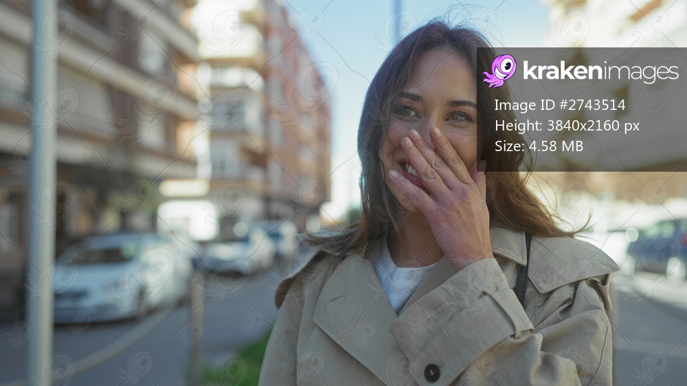 Woman smiling in a city street on a sunny day wearing a beige coat with buildings and cars in the background showcasing urban outdoor lifestyle.