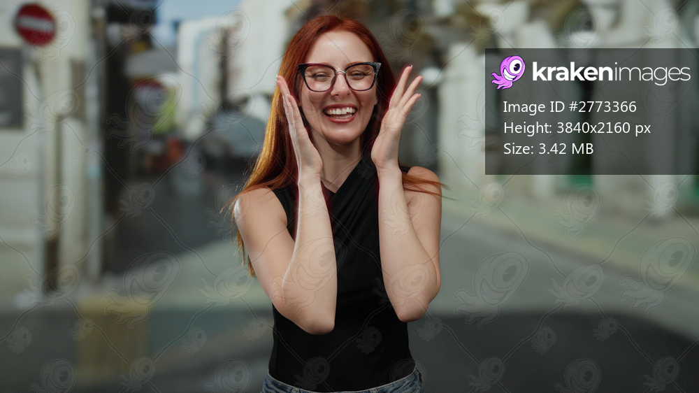Woman smiling in a city street wearing glasses with red hair and casual outfit, expressing happiness and youth in an urban outdoor scene on a sunny day. - Kraken Images