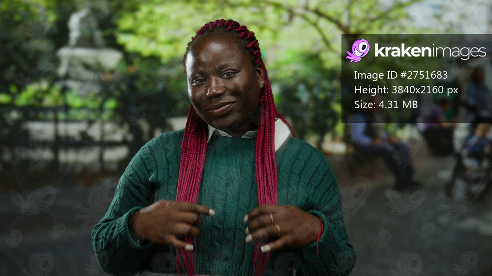 Woman smiling in a colorful park setting with vibrant greenery and people in the background, creating a lively outdoor atmosphere.