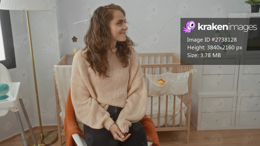 Woman smiling in a cozy bedroom with a crib, dressed in a soft sweater, surrounded by nursery furniture, exuding a sense of warmth and domesticity.