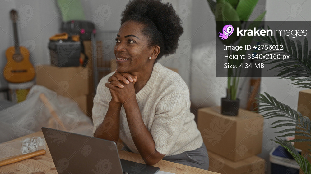 Woman smiling in a cozy living room surrounded by moving boxes and plants, suggesting a sense of new beginnings in her modern apartment.