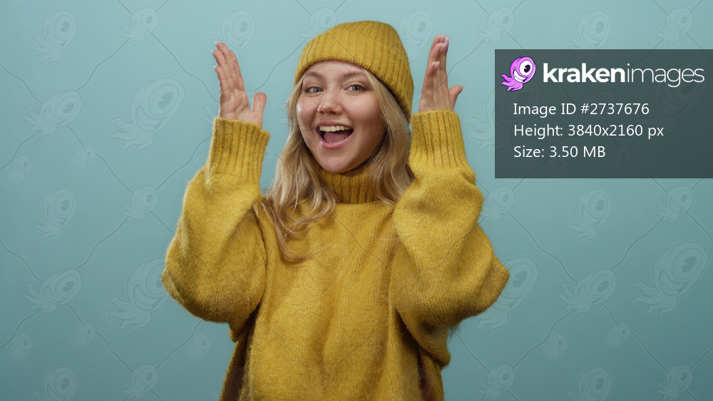 Woman smiling in a cozy yellow sweater and matching beanie, against a solid blue background, captures warmth and happiness on an isolated wall.