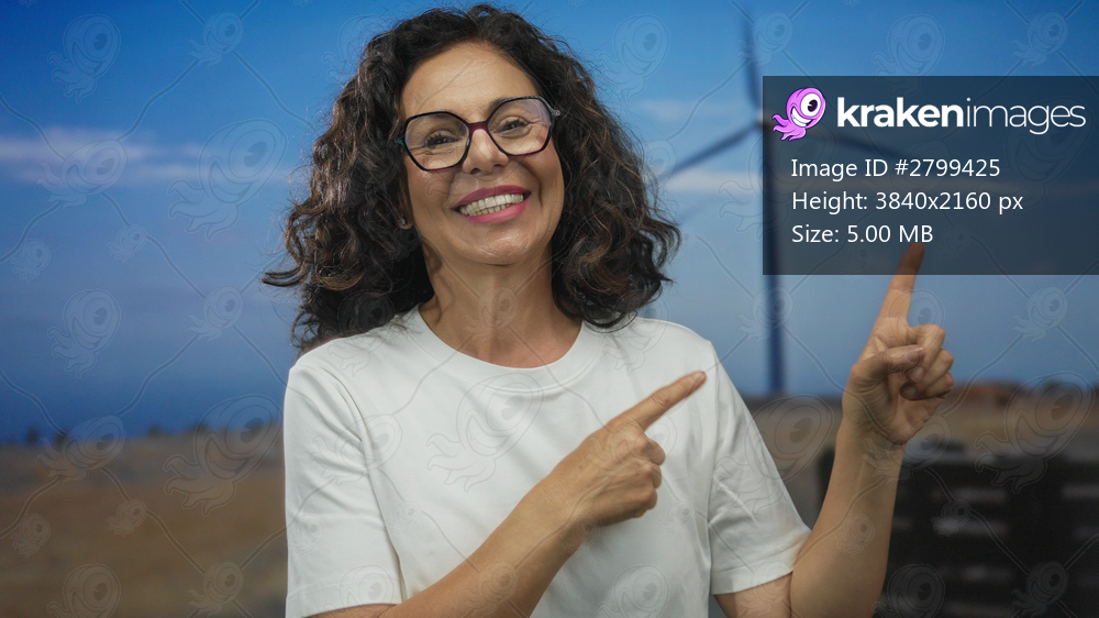 Woman smiling in a field with a windmill, wearing glasses and pointing, representing renewable energy and outdoor lifestyle.