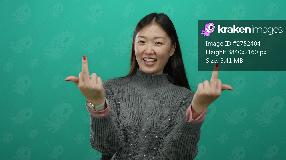 Woman smiling in a gray sweater gestures with middle fingers against a vibrant green background, capturing a bold expression and confident demeanor, showcasing casual attire. - Kraken Images