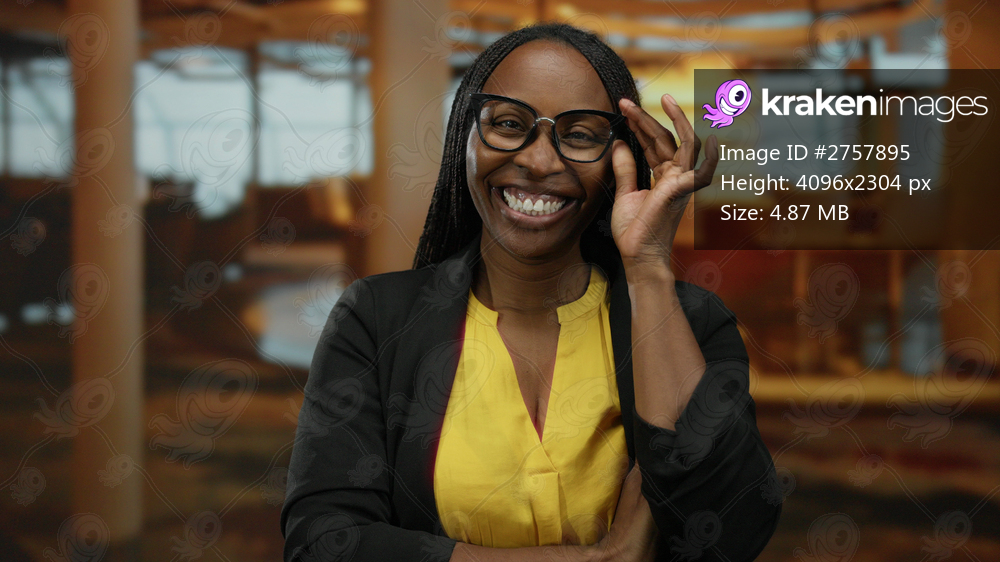 Woman smiling in a hotel room wearing glasses and yellow shirt, conveying warmth and joy in an inviting indoor setting.
