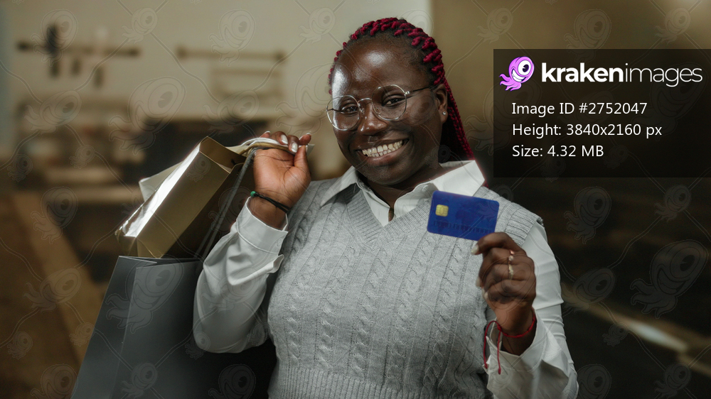 Woman smiling in a kitchen holding shopping bags and a credit card, wearing glasses and a sweater, showcasing a successful shopping experience indoors. - Kraken Images