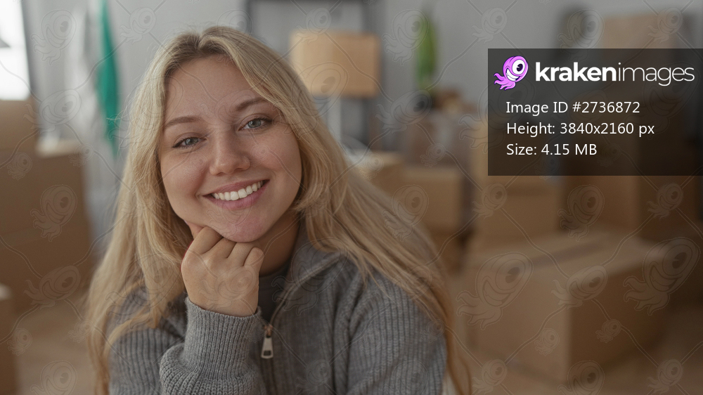 Woman smiling in a living room filled with moving boxes suggesting new home and fresh beginnings in a cozy indoor setting, blonde hair and youthful appearance indicating excitement. - Kraken Images