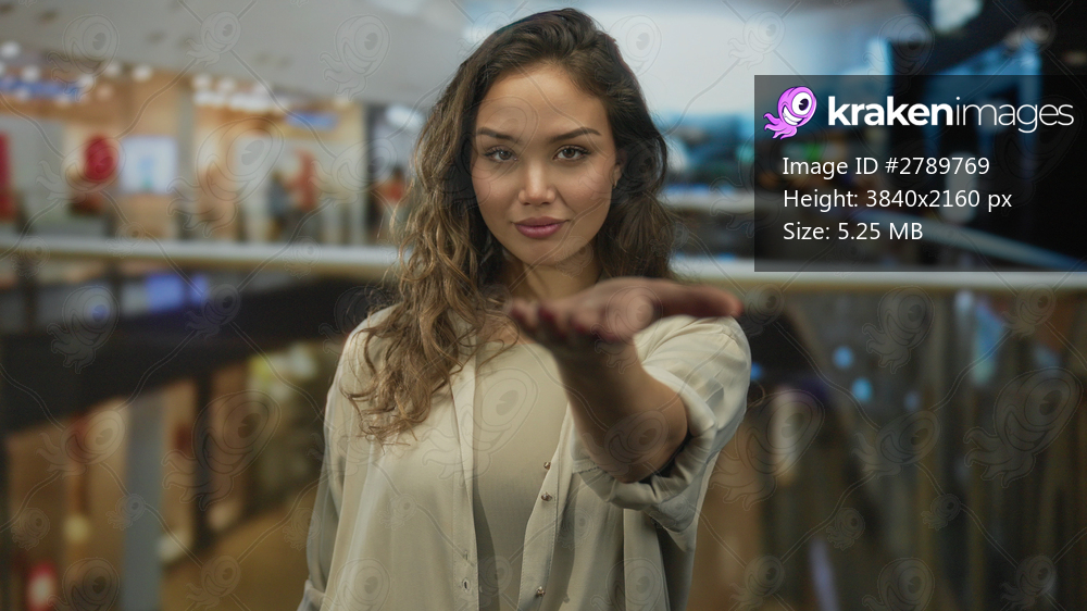 Woman smiling in a mall center with an open hand gesture, embodies youth and friendly demeanor amidst bustling shops indoors.