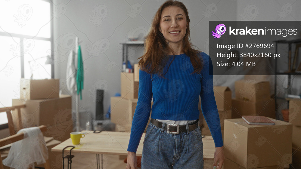 Woman smiling in a new home surrounded by moving boxes and furniture in a bright living room, conveying a sense of excitement and anticipation.