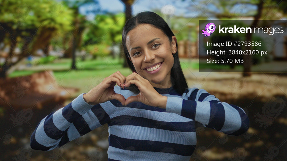 Woman smiling in a park making heart gesture, under sunny skies, surrounded by lush greenery, expressing joy and love, wearing striped sweater, embodying happiness outdoors. - Kraken Images
