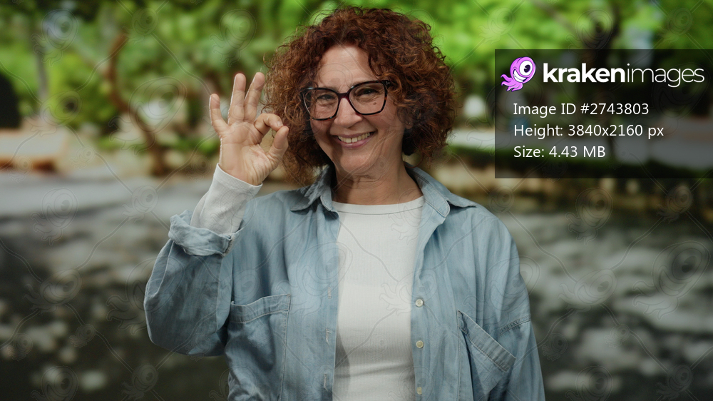 Woman smiling in a park, wearing glasses and casual clothes, gesturing thumbs up with a bright expression, surrounded by green trees on a sunny day.