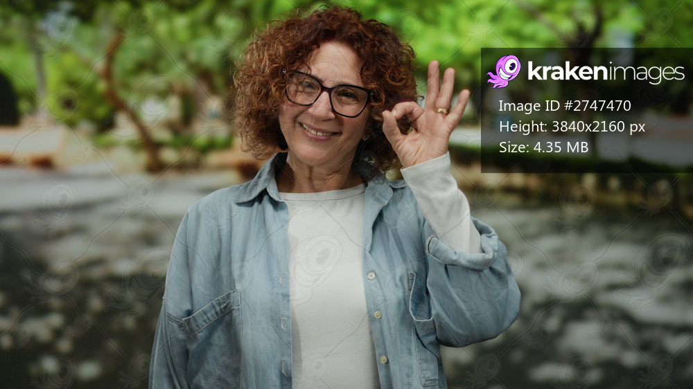 Woman smiling in a park, wearing glasses and casual clothes, gesturing thumbs up with a bright expression, surrounded by green trees on a sunny day.