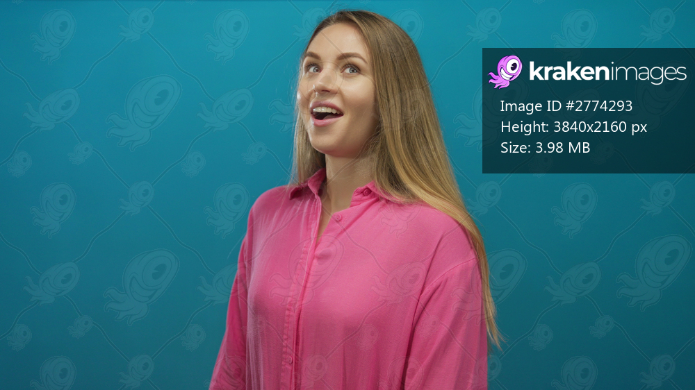 Woman smiling in a pink shirt against an isolated blue background wall, capturing youthful energy and positivity in a vibrant setting.