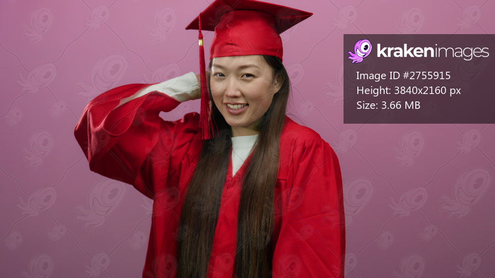 Woman smiling in a red graduation gown and cap against a pink background with long hair and hand raised to the tassel, symbolizing academic achievement and joy. - Kraken Images