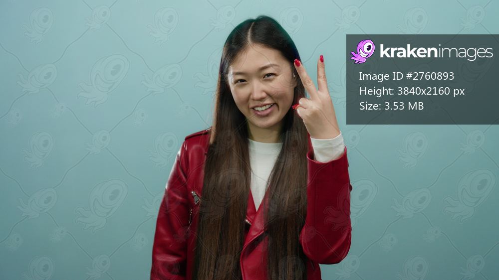 Woman smiling in a red jacket against a blue background showing a peace sign with confidence and joy.