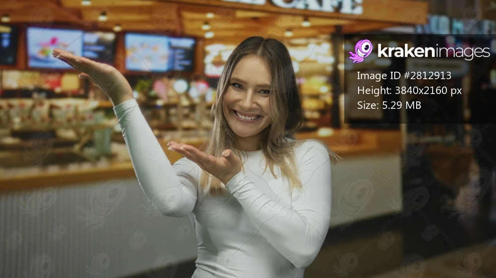 Woman smiling in a restaurant while presenting an inviting gesture with her hands, highlighting the cozy indoor coffee shop ambiance.