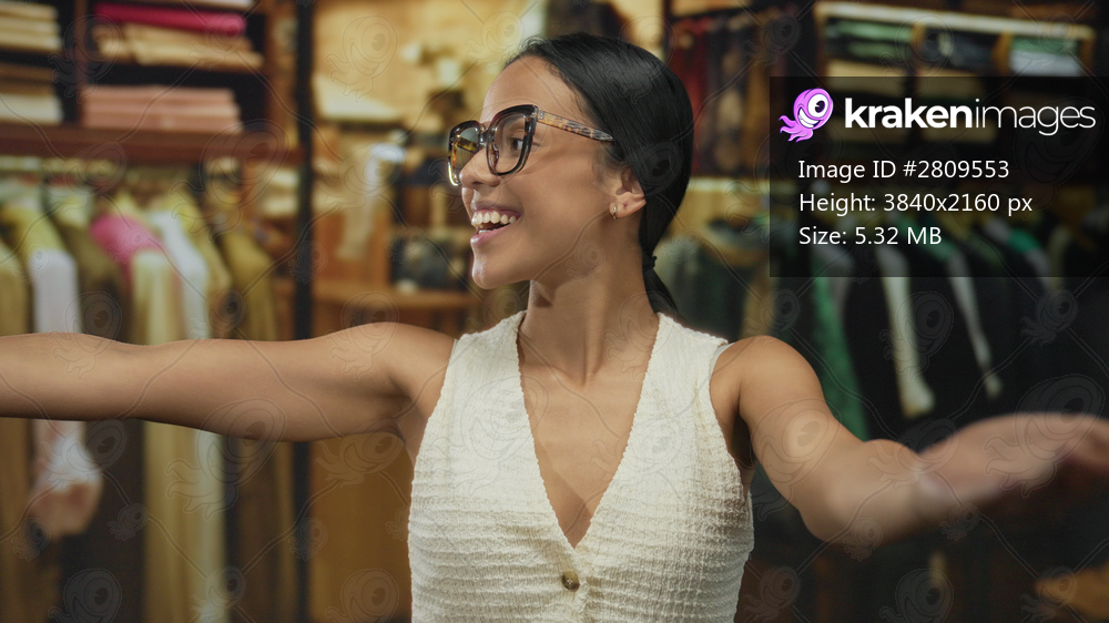 Woman smiling in a retail clothing store surrounded by garments, expressing joy with open arms and glasses, reflecting a vibrant shopping experience.