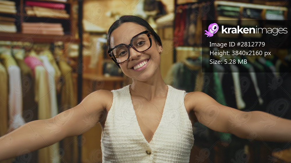 Woman smiling in a retail clothing store surrounded by garments, expressing joy with open arms and glasses, reflecting a vibrant shopping experience.