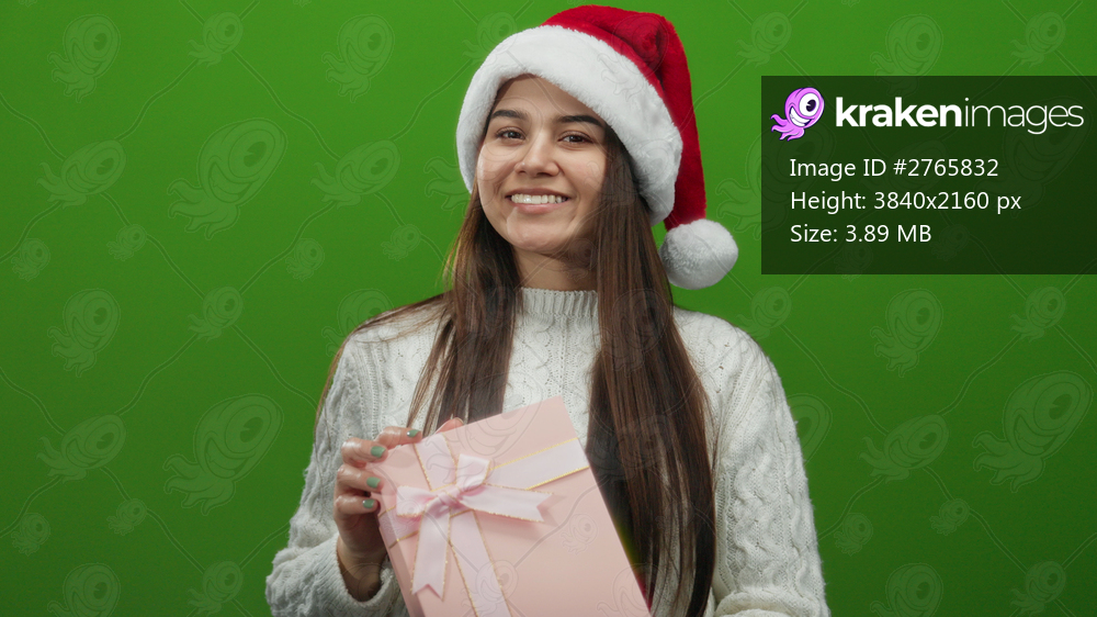 Woman smiling in a santa hat holding a gift box against a green background, evoking festive holiday cheer and joy.