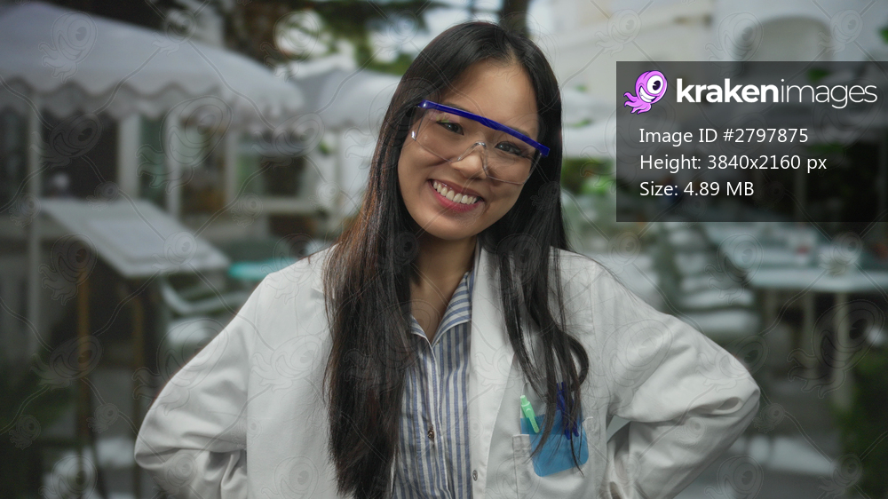Woman smiling in a scientist uniform with safety glasses points at the camera while enjoying an outdoor terrace at a restaurant, blending science and leisure. - Kraken Images