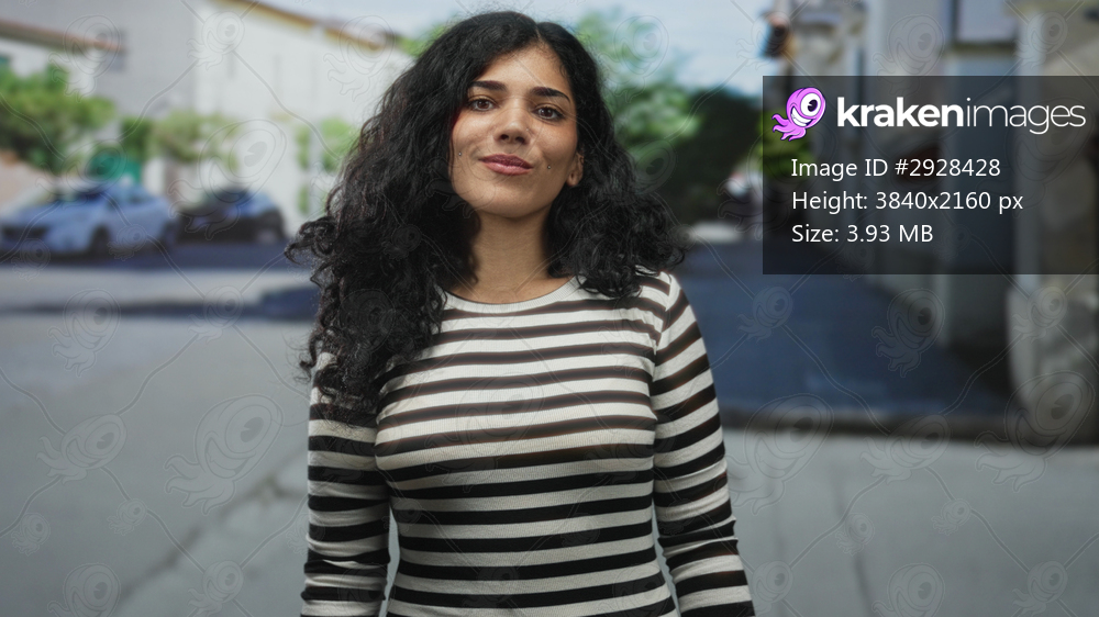 Woman smiling in a striped shirt standing on a city street near parked cars in daylight, looking ahead; urban confidence.