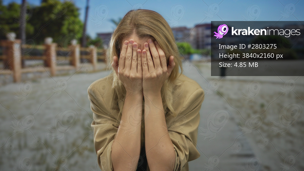 Woman smiling in a sunny park, hands uncovering her face, blonde hair, wearing glasses, showcasing playful joy in an outdoor green setting.