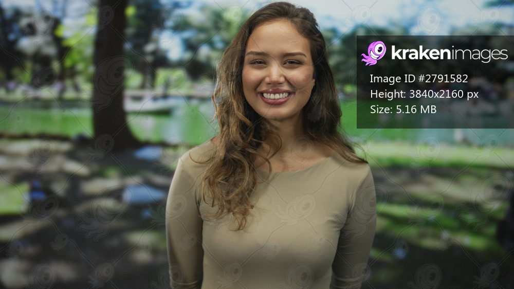 Woman smiling in a sunny park with lush greenery and trees, enjoying a bright outdoor setting with a peaceful atmosphere, perfect for a nature-themed project. - Kraken Images