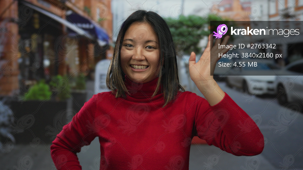 Woman smiling in a vibrant city street setting, wearing red sweater, exudes youthful and energetic charm while waving happily at the camera with urban elements in the background. - Kraken Images