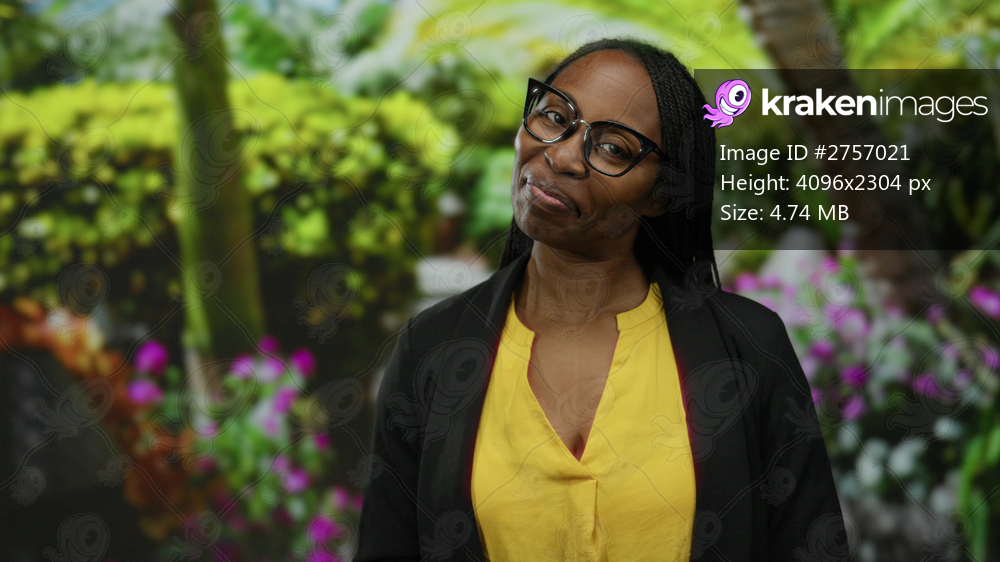 Woman smiling in a vibrant park with flowers wearing glasses and a yellow blouse under a black jacket, showcasing a cheerful outdoor scene in natural light. - Kraken Images