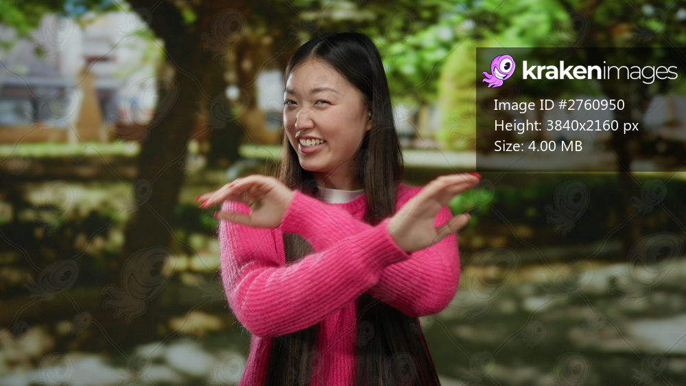 Woman smiling in a vibrant pink sweater enjoys sunny day in a beautiful green park, expressing happiness surrounded by nature and trees, showcasing joyful moments outdoors. - Kraken Images