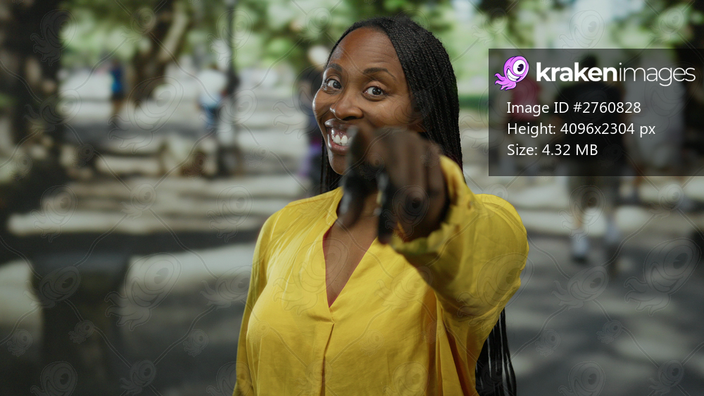 Woman smiling in a vibrant yellow shirt outdoors in a park, capturing the joy of a sunny day with trees in the background and people walking.