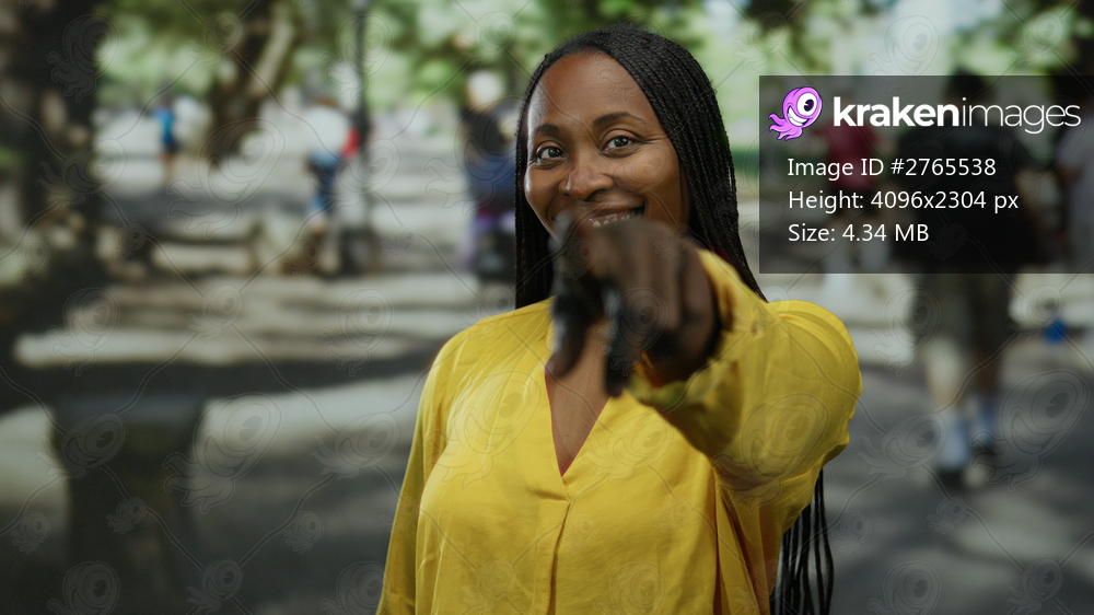 Woman smiling in a vibrant yellow shirt outdoors in a park, capturing the joy of a sunny day with trees in the background and people walking.