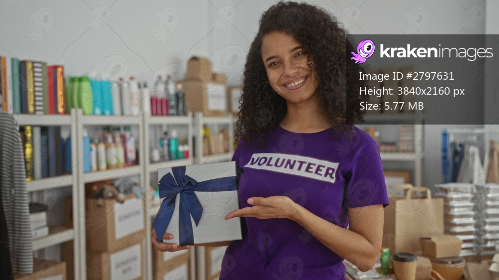Woman smiling in a volunteer center holding a gift box, wearing a purple shirt, surrounded by donation items on shelves, emphasizing generosity and community support. - Kraken Images