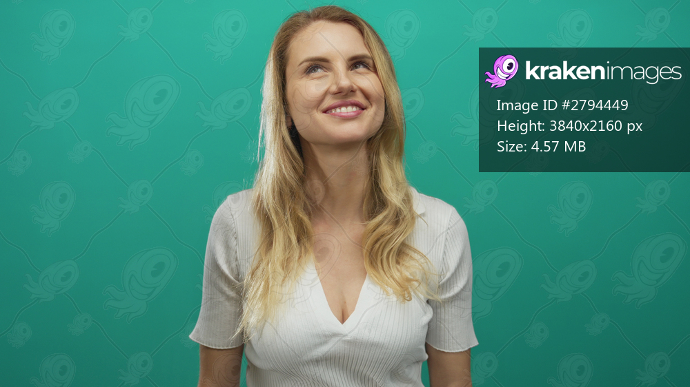 Woman smiling in a white shirt against a vibrant green background, blonde hair cascading over shoulders, creating a serene and joyful scene evoking calm and confidence. - Kraken Images
