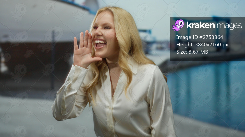 Woman smiling in a white shirt by a port with boats and ships in the background on a sunny day.