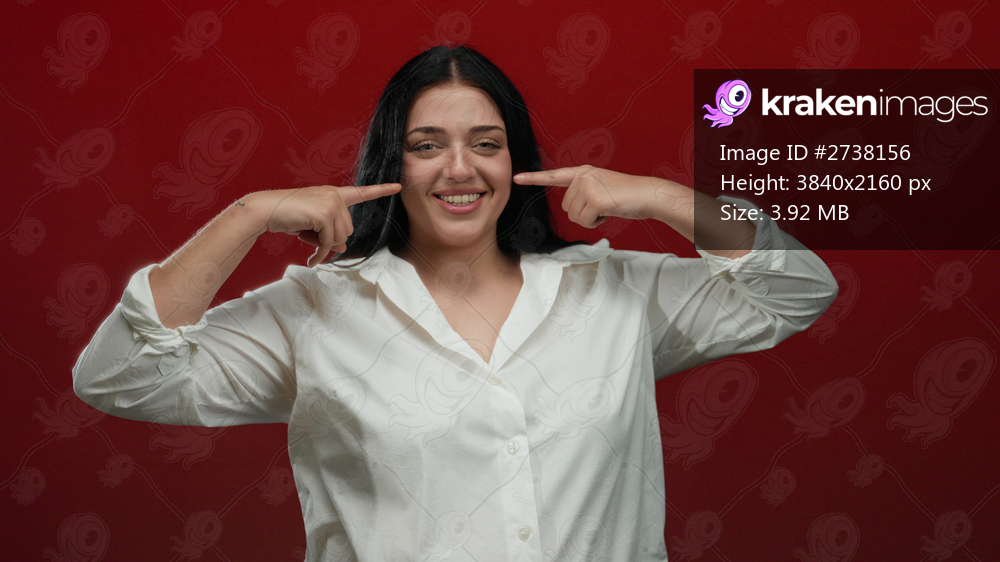 Woman smiling in a white shirt pointing at her face against a bright red background, conveying happiness and positivity.