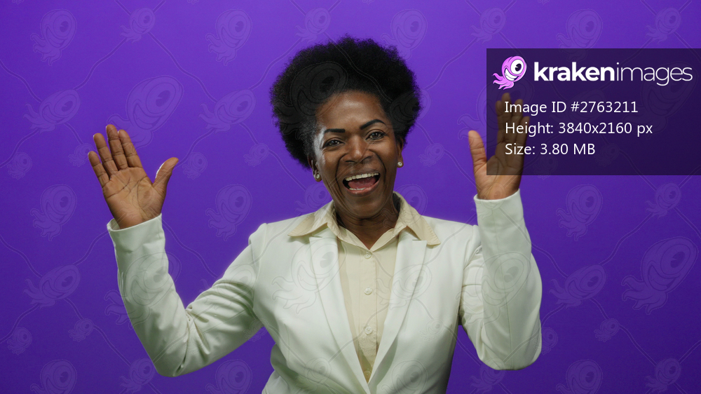 Woman smiling in a white suit against a vibrant purple background, showcasing happiness and professionalism, with hands raised in a lively expressive manner. - Kraken Images