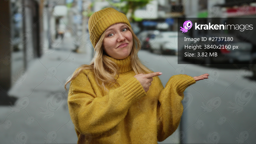 Woman smiling in a yellow sweater and hat, pointing on a city street, showcasing urban lifestyle outdoors in a vibrant cityscape during daytime.
