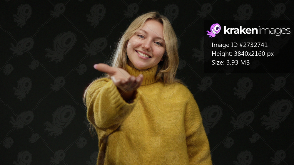 Woman smiling in a yellow sweater on a black background reaching out with an open hand gesture young blonde female displaying friendliness and warmth.
