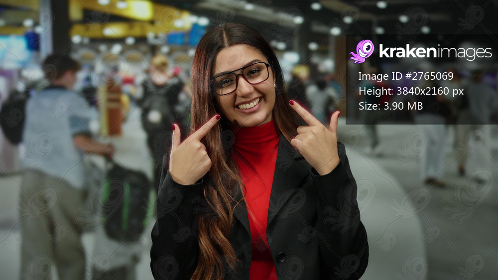 Woman smiling in airport terminal with glasses pointing at smile amid people walking in background.