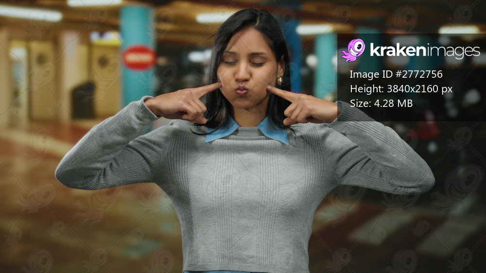 Woman smiling in an indoor parking garage with cars in the background, wearing a gray sweater and blue collar, conveying a cheerful and positive demeanor. - Kraken Images