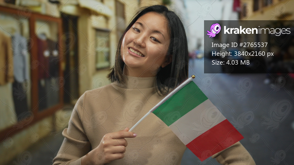 Woman smiling in an italian street holding an italian flag, representing cultural connection in a vibrant city outdoor setting.