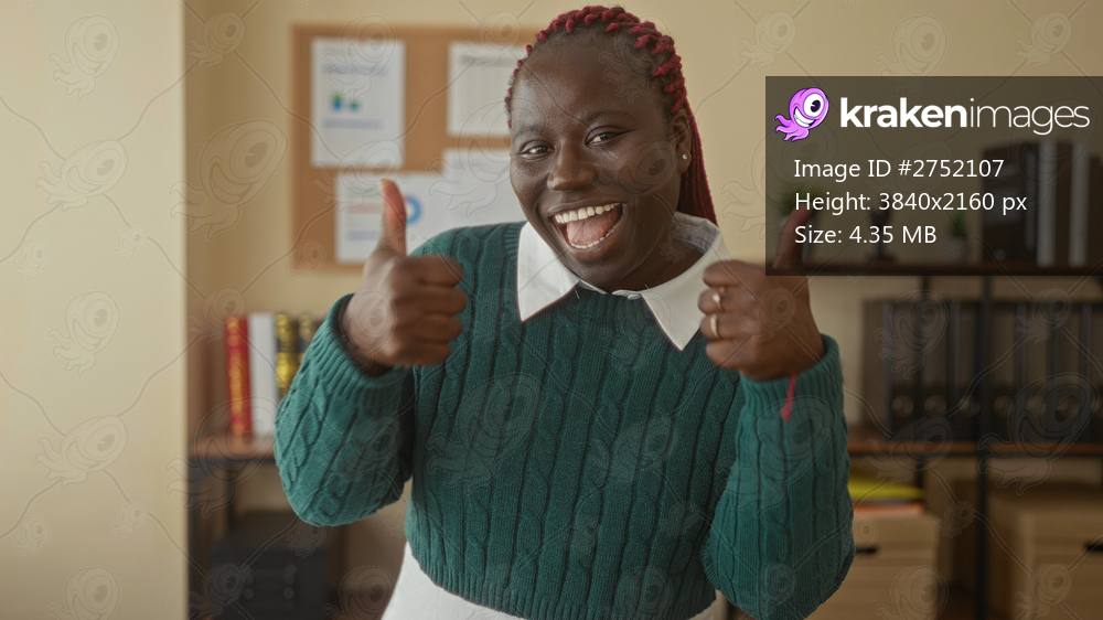 Woman smiling in an office giving thumbs up, showcasing confidence and positivity in a workplace environment, emphasizing her cheerful expression and professional attire. - Kraken Images