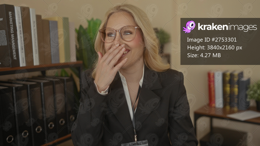 Woman smiling in an office setting surrounded by books and plants, projecting a professional and cheerful atmosphere with modern decor.