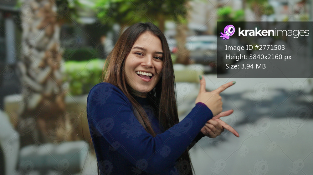Woman smiling in an urban street setting, pointing cheerfully with a playful expression, capturing the essence of youthful joy in a vibrant outdoor environment. - Kraken Images