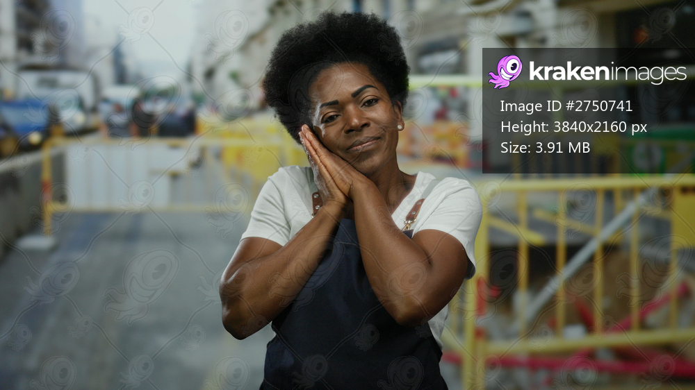 Woman smiling in apron at construction site captures a cheerful mood, highlighting an african american presence amidst an urban landscape.