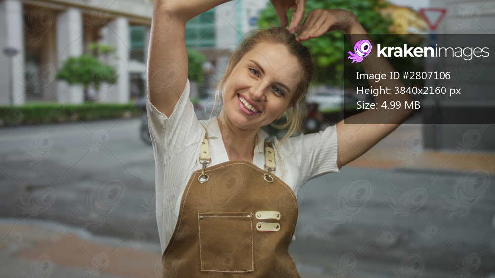 Woman smiling in apron making heart gesture with hands on city street, showcasing joyful emotion and outdoor setting with soft focus urban background.