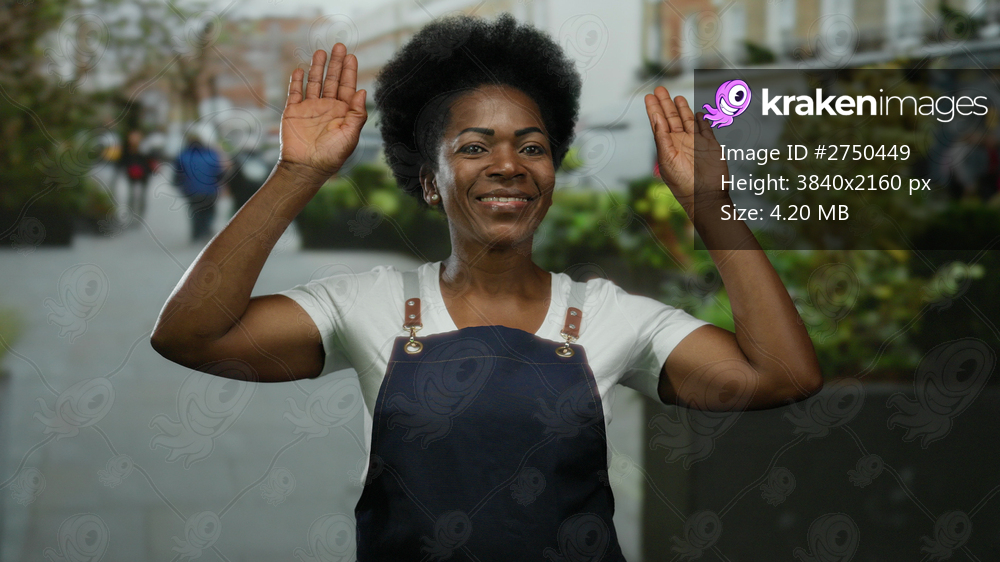 Woman smiling in apron on busy city street, capturing urban outdoor scene with natural background, conveying vibrant city life and diverse metropolitan environment. - Kraken Images
