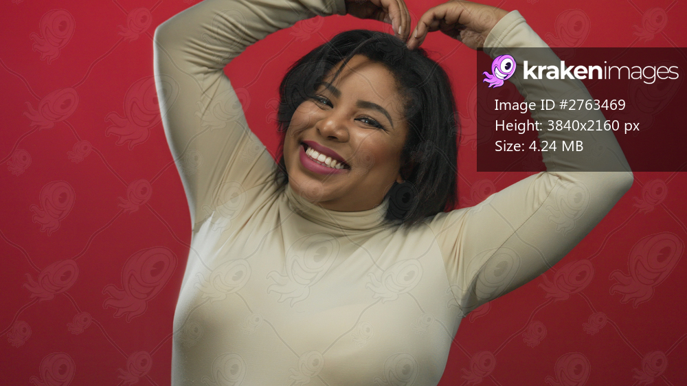 Woman smiling in beige shirt making heart shape with arms on red background expressing joy showcasing latin beauty and confidence on isolated backdrop. - Kraken Images