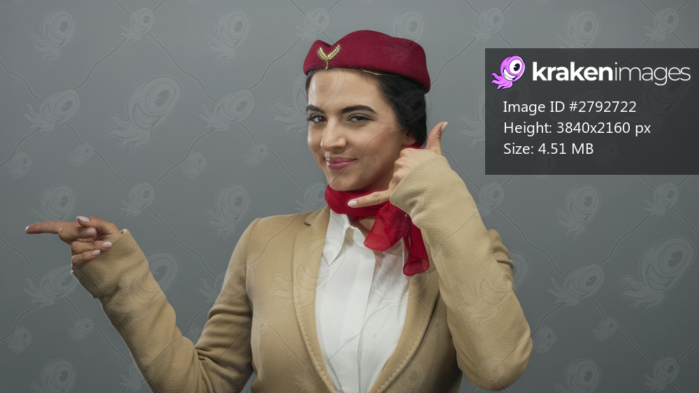Woman smiling in beige uniform with red scarf and cap gesturing phone call and pointing against grey wall background showing friendly assistance